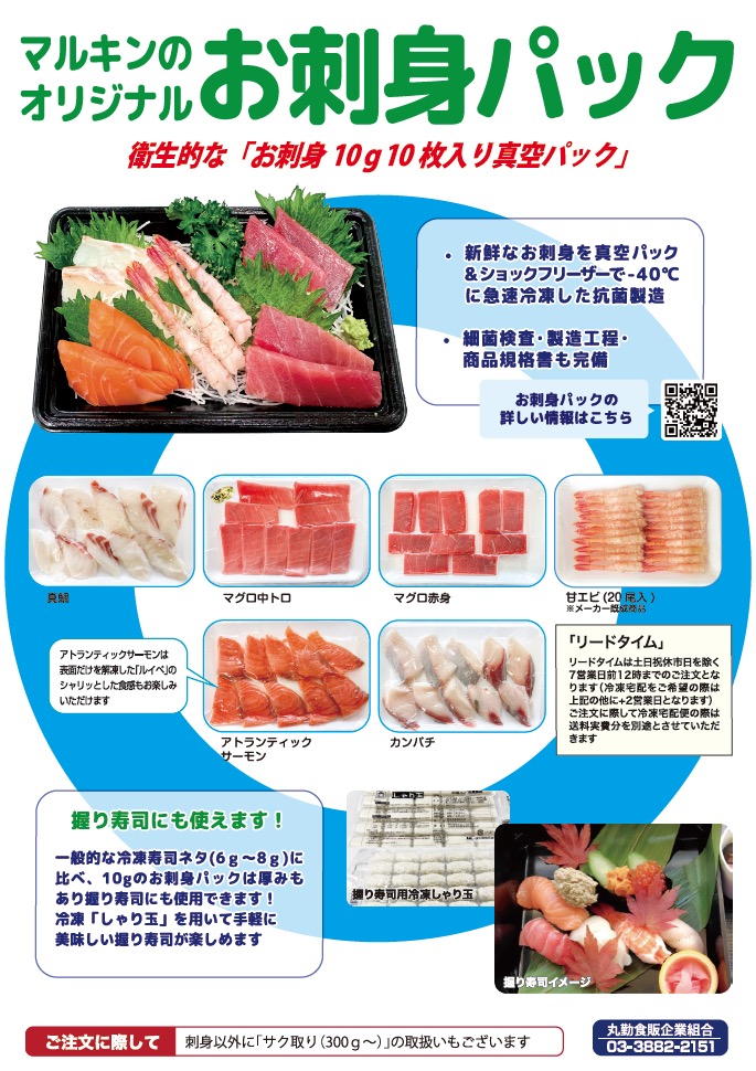 ホーム>鮮 魚> お刺身 お刺身 衛生的で“安心なお刺身”あります! マルキンのオリジナルお刺身パックは、「新鮮な原料」と「衛生的な製造工程」によってお刺身を加工し、ショックフリーザーによる「急速冷凍と真空パック」処理した抗菌製造です。開封せずに流水解凍が可能なためドリップや臭みのない衛生的なお刺身をご提供できます。 PDFダウンロード(1.1MB) ※刺身以外に「サク取り(300g~)」の取扱いもあります※クール宅配便にて全国配送受け賜わります
